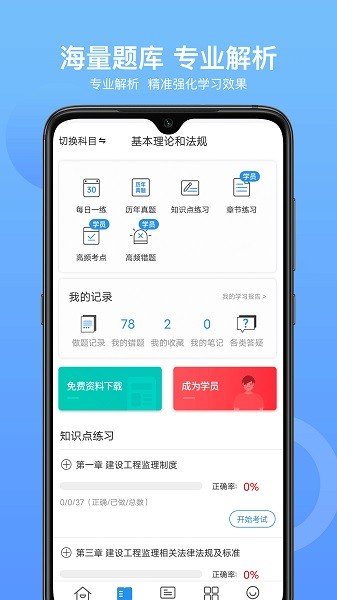 本应用涵盖智能题库、视频课程、直播课堂、自学学习包等等多种助考功能。满足监理工程师考生自学、刷题、听课等各种备考需求。帮助您在考试路上省时省力,顺利通过监理工程师考试!