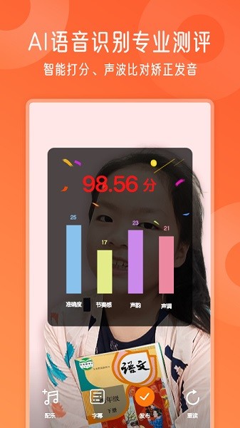 1、全新的录音体验,配合订制的背景音乐,有助于小朋友快速进入朗读状态;打分机制的引入使朗读者成就感倍增;