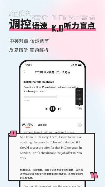 【精听训练】历年听力真题开启精听训练,中英对照,语速调节,逐段反复精听,结合真题解析,K.O听力盲点!