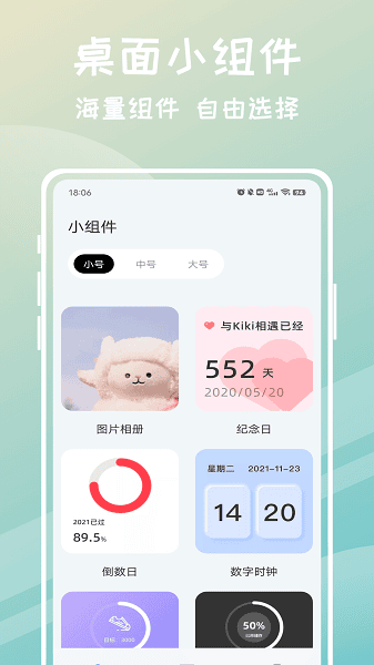 多款小组件自由组合,已支持:照片、倒数日、纪念日、数字时钟、运动步数、手机存储、天气、每日一言等,自定义小组件,DIY定制你的专属小组件!