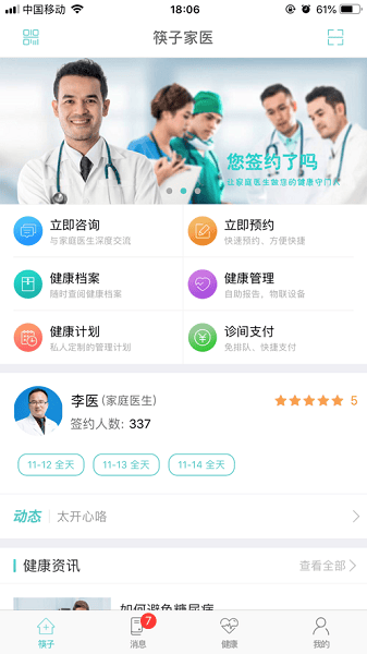 筷子家医app是您的随身医生,能够随时在线咨询各科室的医生,专业医生为你解答问题,线上互动交流更为方便,个人健康档案随时查询,为你的健康保驾护航。
