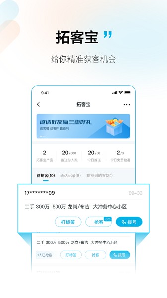 拓客本app是一款专为房产经纪人打造的拓客软件,软件中有很多的实用工具。在这里能够查看各大房源信息,客源的线索,帮助经纪人便捷找客源,提升工作效率。