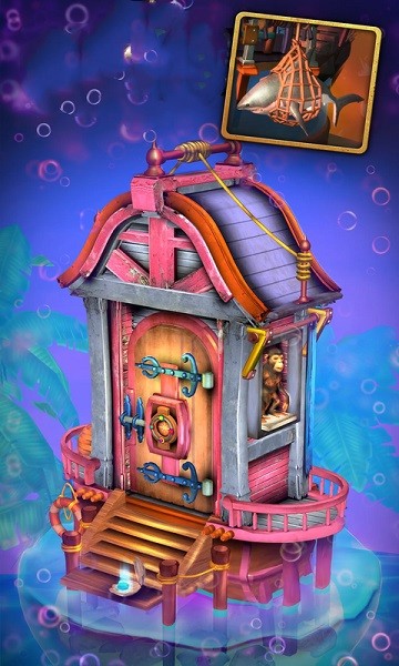 2.触发第二段教程后,先返回缩小画面,将灯塔转动到下图的角度,上方的盒子可划动打开获取【红宝石】,下方可获取【船轮】和【蓝宝石】。