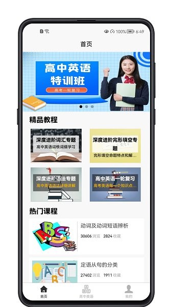 高中英语教程app汇聚了丰富的教学资源,更有一些精品的教程可以学习,同时还会为大家推送一些热门的课程内容,各个学习的板块划分清晰,让大家能够有针对性的学习,是专为广大的高中学生打造的。