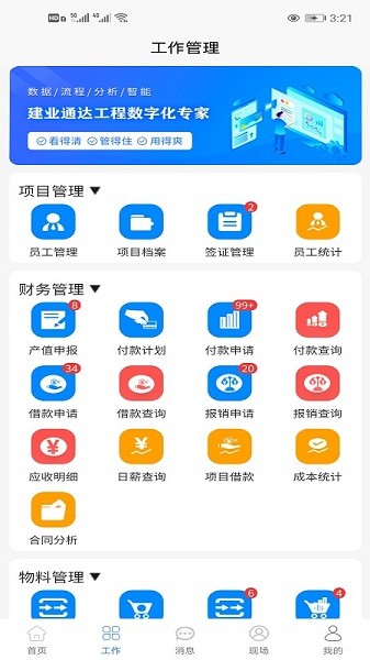 3.拥有多种丰富的工作管理页面,这里的功能应用划分付款管理以及物料管理等栏目,还有丰富功能图标;