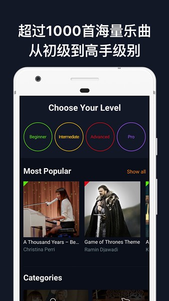 - 超过1000首曲目,从初级到高级、从古典到流行乐供你选择。