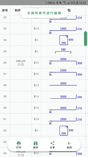 可在Android手机上实时管理料表文件,可对料表文件进行查看、删除、分享、修改等操作。并且可以通过手机连接蓝牙或wifi打印机进行料单、料牌、绑扎料牌的打印。