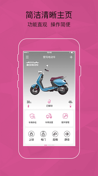 爱玛智能云端app是专为广大的爱玛电动车车主打造的手机应用,提供了车辆体检、车辆设置、配件管理等等服务,可使用手机对车辆进行上锁、静音等等操作,绑定一次之后即可自动识别了。