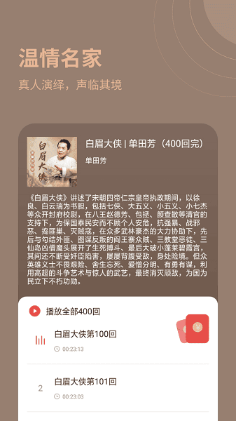 甜枣畅听app有着超多的有声资源,戏剧、相声、书籍等等,男女老少,任何用户喜欢的都可以在这里找到,一键轻松畅听,精彩内容享受不停,根据你的喜好智能推送。