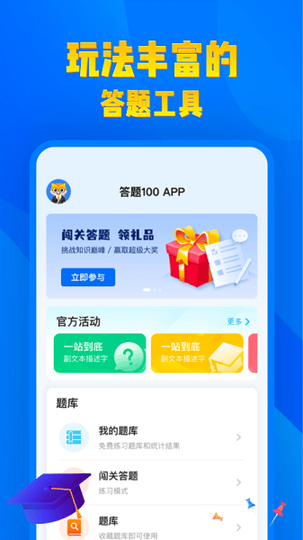 答题100让你在线就能联系各种答题,内置的题库版块非常丰富且能满足绝大多数用户的需求,并且还能在软件中自己进行题目的导入,导入完成之后就算离线也能进行练习!