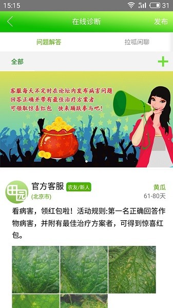 农民朋友可以通过app咨询各作物专家病虫害类的知识,同时也可以通过作物论坛与其他种植户交流。并且可以通过附近功能很方便的找到附近农资店,咨询购买农资。