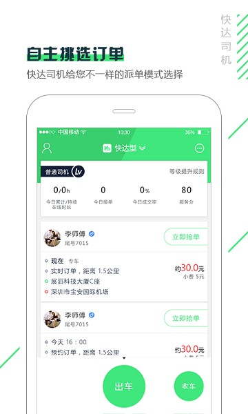 快达用车司机端app拥有不同的派单模式,根据司机的情况,每天都会智能派出海量的订单,界面设计简约,功能一览无遗,轻松上手,轻松拉到乘客,精准定位导航无须担心。