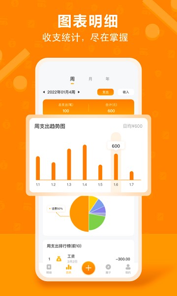 细分报表,支持1、2级分类报表统计,轻松了解资金去向,及时修正消费习惯。