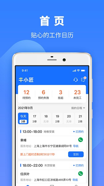 牛小匠app是专为家装安装的师傅提供的线上接单平台,里面的订单不断更新,不用为了没单接而烦恼了,可以帮助大家增加日常的收益,到达工作地点可一键签到。