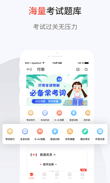 集申论与行测为一体,所研发内容数次押中考题,助力考生公考要上岸。利用公考教育人工智能算法,通过对100万优秀学员的学习数据进行分析,推出针对不同人群的自适应学习方案,让学员彻底摆脱不知道如何备考的问题,让备考更简单,更具有针对性。