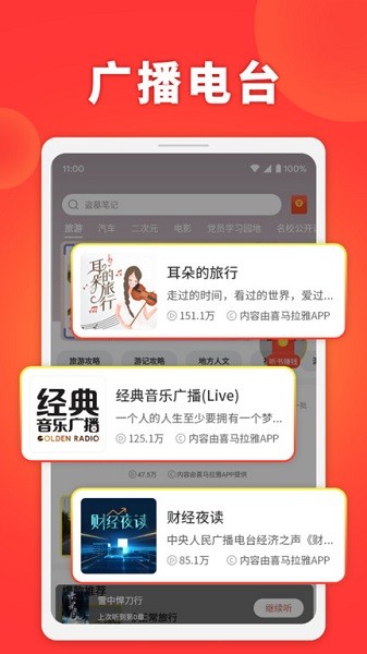 精准个性化推荐,播放流畅,打造贴心畅听环境!百万免费内容供您倾听,热门小说,头条资讯,教育频道公开课,音乐脱口秀,情感电台等,只要你想听,这里都能找到你喜欢的内容。