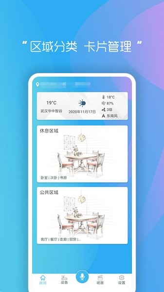 睿创智能家居app可自定义公共区域、休闲区域等等管理卡片,家里设备的状态都掌控在你手上,可与空调、灯光、暖气、报警器等等进行配对使用,同时提供了自定义场景的功能。