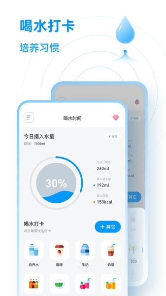 3.种类丰富;不仅仅是白开水,我们还拥有咖啡、牛奶、奶茶、饮料、茶、苹果汁、橙汁分类,让您自定饮品种类,提高记录的精准度。