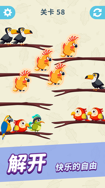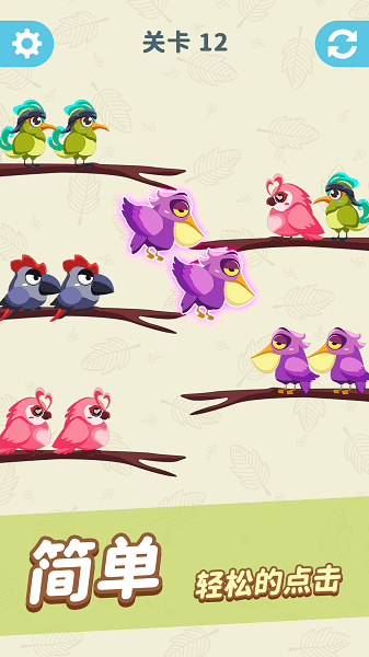 一款非常有趣的益智闯关游戏,玩家需要将同样的小鸟分配到同一树枝上进行消除,游戏玩法休闲益智,转动你的大脑,快来闯关吧。