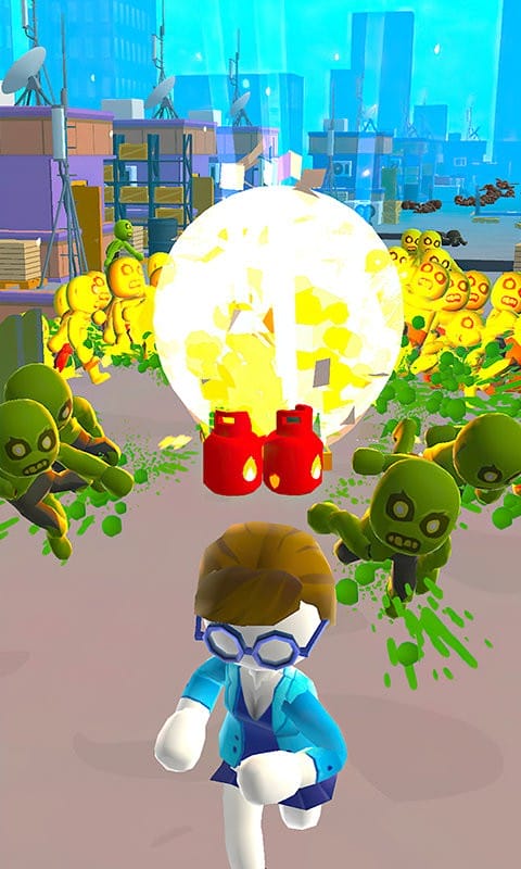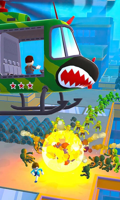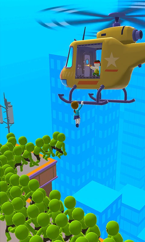 画风竖版卡通,在直升飞机逃生3d游戏之中你需要帮助主人公在僵尸密布的天台之上成功的逃到直升机里。