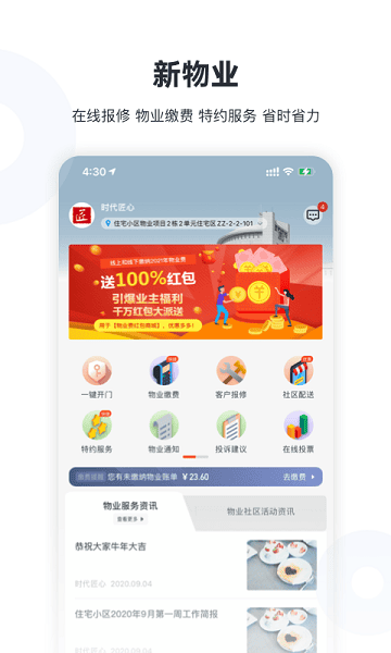 一个全国共享的物业服务APP平台。物业公司可以开展在线报修、在线投诉、在线缴费,发布服务热线、物业通知和社区资讯,开展物业公示、特约服务等,还可以开展在线投票、满意度测评,组织社区活动、组织周边商业商户上线经营、开展租赁业务等。