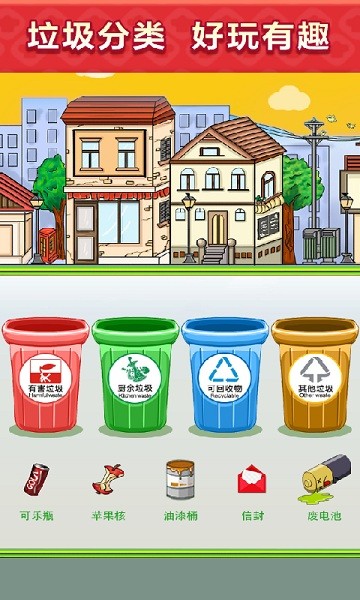 本游戏真实模拟垃圾分类的场景,让玩家在互动游戏中学会垃圾分类的正确方法。现加入垃圾车游戏玩法,垃圾桶游戏玩法,垃圾分拣员闯关玩法。采用的垃圾分类的规则为:可回收物、有害垃圾、厨余垃圾、其他垃圾。