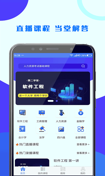 这里有在线课程,在线直播+录播,全程名师授课,工商管理、人力资源管理、会计、法学、金融、软件工程、护理学等多个本科专业课程。在线免费题库,大学生学习助手。