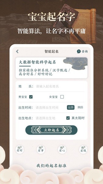 名字打分,根据您设置的要求,比如宝宝的生辰、带某个字,就能获得你想要的名字,八个角度全方位解析名字,名字打分,姓名详解、说文解字、名字笔画解析、流行趋势、重名查询、音调解析、字形结构解析,读懂名字背后的寓意。