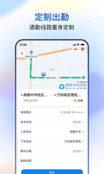 【定制出勤】:定制线路预约以及购买车票,一键刷码乘车