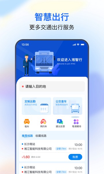 湘智行app应用互联网技术,专注于为用户提供综合型的出行服务,公交、地铁、打车等等方式全都可以选择,根据出发地和目的地智能化定制出行方案,使用便捷。