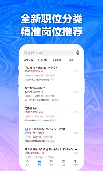智能搜索,你可以直接输入自己想要的关键字,都可以查询到信息,找到喜欢的工作更方便