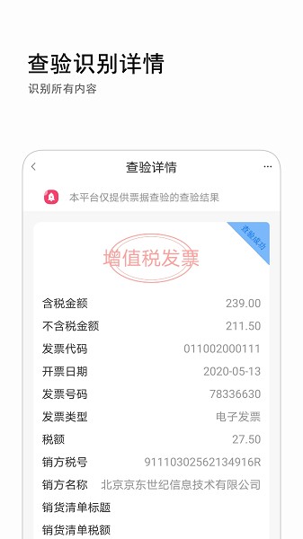 发票查询系统支持查询发票的真伪,只需要使用软件扫描即可,更有一些其他的票据识别的功能,一些纸质的票据也是支持的哦,查验的详情都会为大家清晰的展示。
