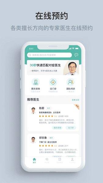 通过APP提供了眼科专家图文问诊、云门诊、普通预约挂号的业务,患者可根据自身需求预约医生服务,图文问诊和云门诊是线上服务,患者只需要通过手机便可完成与医生的病情沟通和诊断。