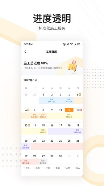 省心装修不用盯,装修日历自动记录全流程各节点,施工服务每日播报。