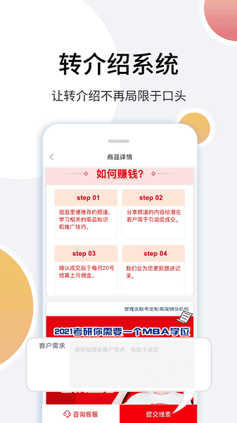 精选优质货源(包括实物商品或服务类产品),推荐者免选品、免囤货、免费用。对于线下成交的商品或服务,可通过提交线索、转介绍方式促进成交,佣金自动结算,推荐者线上提现。