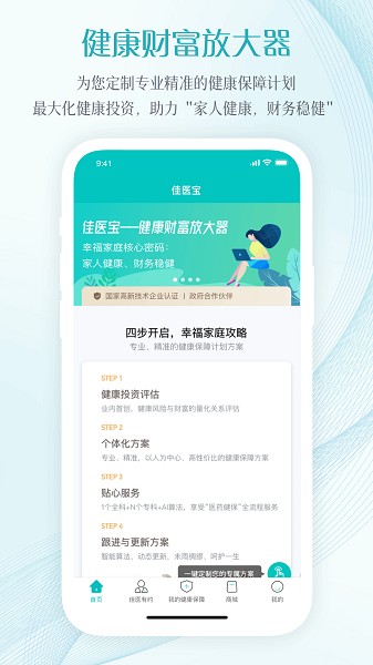 佳医宝您的健康财富放大器。以人为中心,定制全生命周期全健康状态的专业精准的健康保障计划,最大化您的健康投资,助力每个家庭实现“家人健康,财务稳健”。