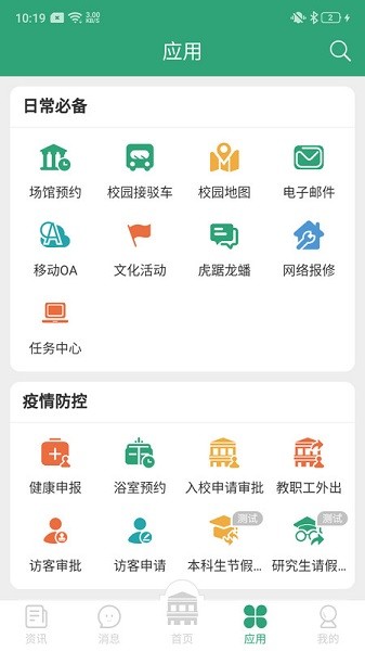 首页设置新鲜资讯、我的应用和我的卡片三大栏目,主要功能迅速get——教学、办公、科研、生活等各类轻应用集于一体。只要您想用,无需安装,时间、空间尽可掌握,各种需求均可满足——场馆预约、课表、入校申请……同时,后续也会有更多服务汇集于此,供您更好轻享~