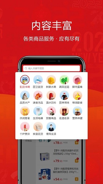 【想吃啥都有】:8000多种商品,涵盖生鲜果蔬、粮油米面、方便速食、厨房调味、日用家化、酒水乳饮、虚拟产品兑换等。