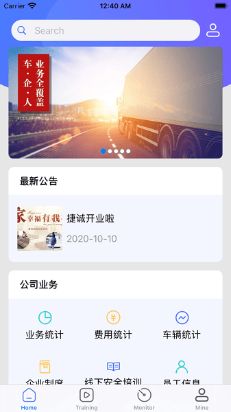 一款可同时管理多家物流企业信息的手机应用,它可以帮您管理企业证件、司机证件、车辆证件,查询车辆在途信息,以及帮助企业员工进行安全培训和测评。
