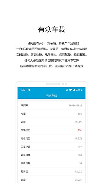 有众车载,一个汽车定位器,一台闲置的手机,安装后,秒变汽车定位器。一台4G智能后视镜/导航,安装后,将拥有车辆定位功能,实时监控、历史轨迹、电子围栏、疲劳驾驶、超速报警…任何人必须在知情自愿的情况下使用本软件,所有功能均面向汽车开发,且应用在汽车上才有效。