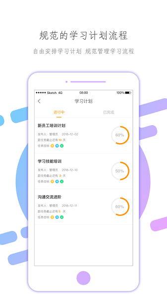 - 学习任务,实时跟踪:根据培训学习计划快速创建学习任务,指派人员进行学习;实时跟踪学习进度,监督学习全过程;