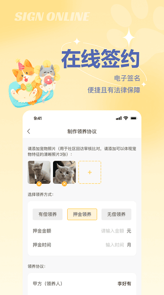 领养代替购买,领养步骤由平台层层把关,签署领养协议由区块链等技术完成智能审阅,实时存证,保障电子签名等数据真实有效,法律保障性更高,猫狗贩子望而却步!