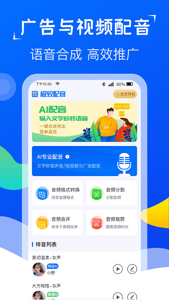 极致配音app能够适用于各行各业的配音需要,内置的音源丰富,并且还能导入文本素材进行自行配音,功能丰富可以满足各类用户的需要,使用起来也非常简单!