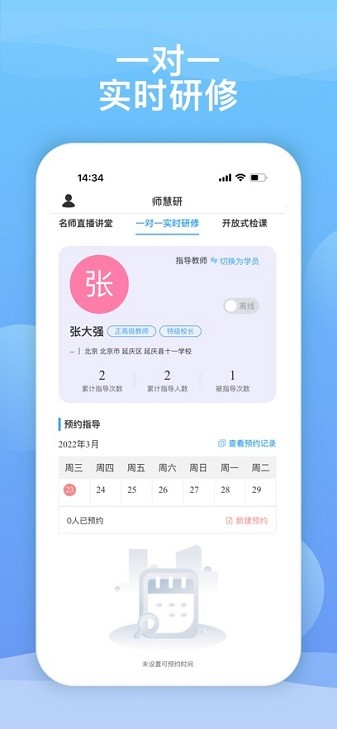 1、一对一实时研修:根据系统推荐或自行预约指导教师发起1对1实时研修,解决自身在教育教学中个性化的问题。