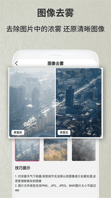 老照片修复翻新软件具有着图像去雾打造的大型摄影摄像类产品,有效去除图片中的浓雾等影响因素,超高清还原清晰的图像设置其中,轻松打造出大片既视感。