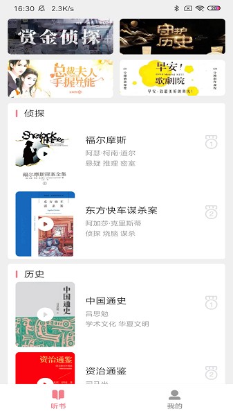 悠然听书中有关于言情,侦探等类目,所有内容全部免费,设置合理,语速标准,快来下载体验吧。