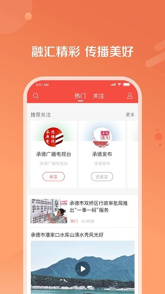 以“引领群众、服务群众”为己任的综合性客户端,既权威、理性、丰富,又生动、活跃、周到,更快捷、更立体、更全面地讲述承德好故事,传递承德好声音,树立承德好形象。