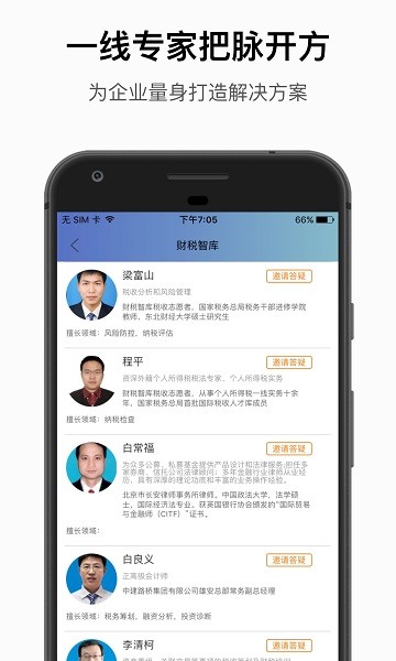 汇集全国近3000名专家:包括财税专家、政策研究专家、各行业一线实战企业家及高管,结合互联网与多媒体,独创“望、闻、问、切”财税问诊式服务模式,提出切实可行的综合解决方案,让咨询不再难。
