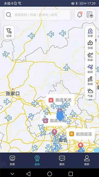 3、监控:地图展示告警内容,展示空域内容,展示机场内容,展示航班内容。默认选中“告警”和“空域”按钮,默认显示“告警”和“空域”内容。点击“告警”大头针,显示机场简要信息,点击机场简要信息视图,跳转到“机场”详情页。点击“航班”大头针,显示航班牌和航班简要信息,点击“航班牌”,成功后,跳转到“航班详情”页。点击“搜索框”,成功后,跳转到“搜索”页,点击“航班号”搜索,和点击“起降地”搜索,例如:点击“航班号”页签,输入B70PD航班号,选择执行日期,2020-01-12 星期天,成功后进入航班列表信息。