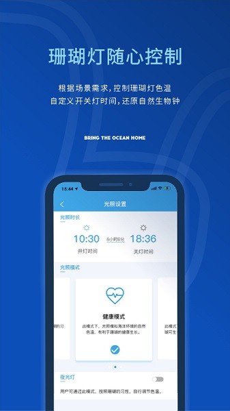 【光照设置】模拟海洋环境光照波长,可切换健康模式/观赏模式,亦可自定义光照波长及设置珊瑚灯开启时间段